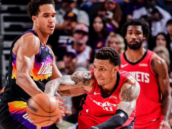 比赛开局,火箭进攻严重哑火,太阳打出24-0的惊人攻势,迅速确立20分以上的优势。首节结束时,太阳以37-21领先。次节,伊森连投带罚止血,阿隆·霍勒迪连中三分帮助火箭缩小分差。尽管杜兰特连续命中三分,半场战罢,火箭仍以54-57落后3分。